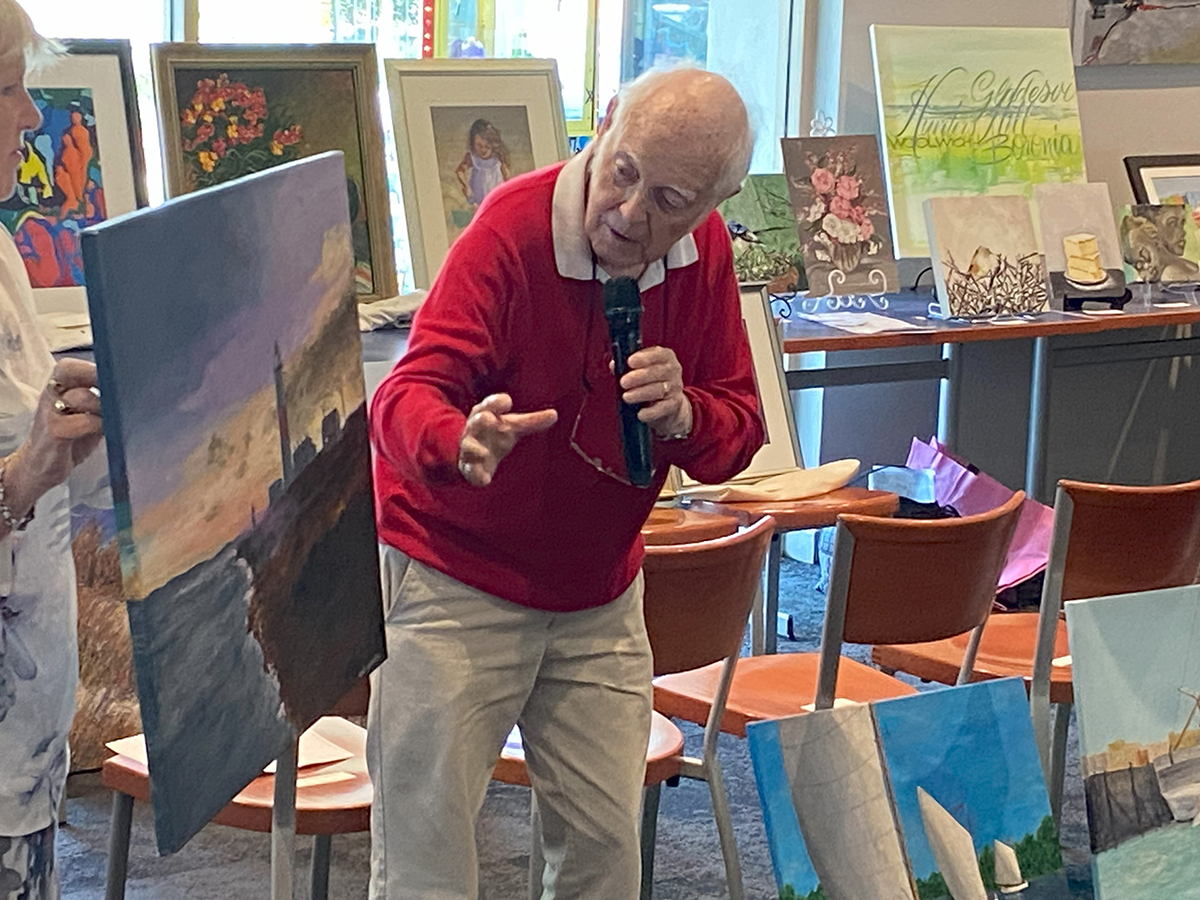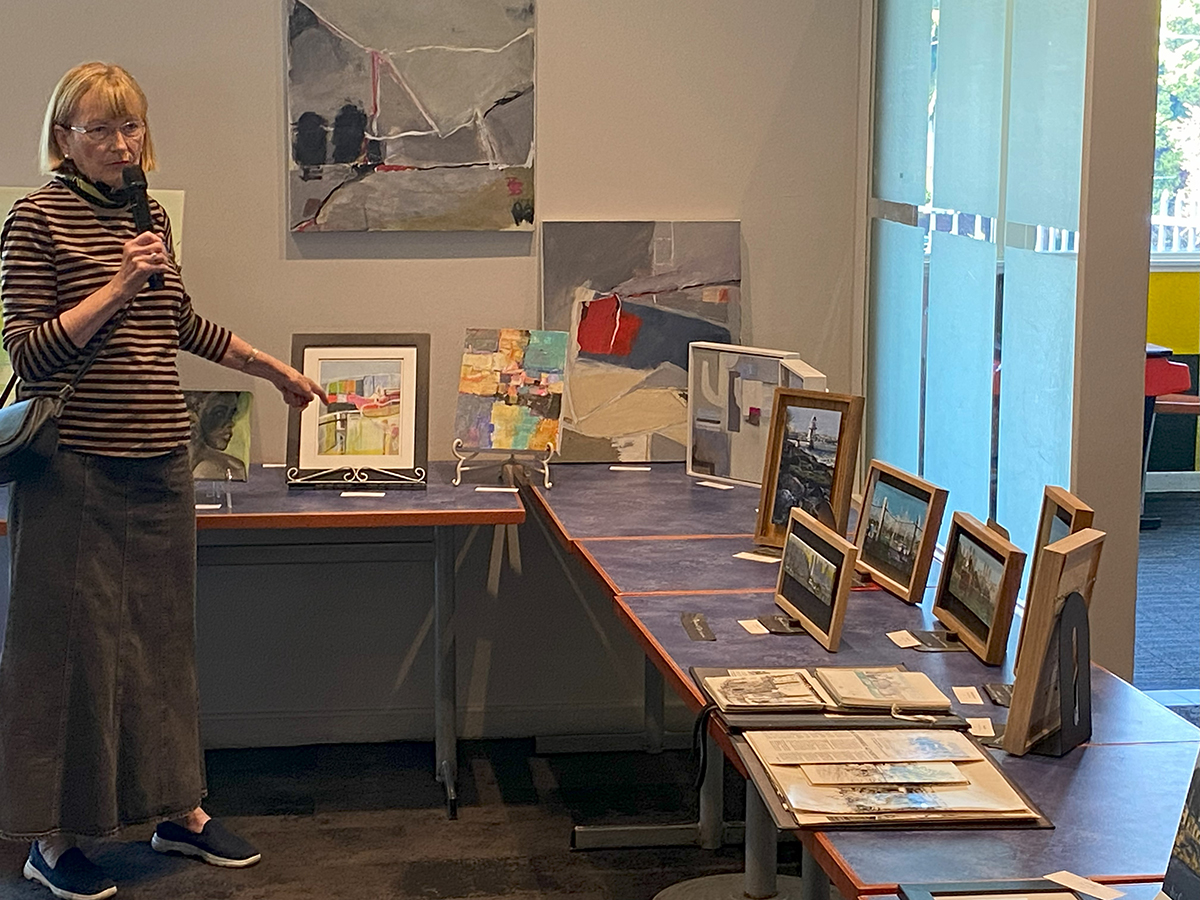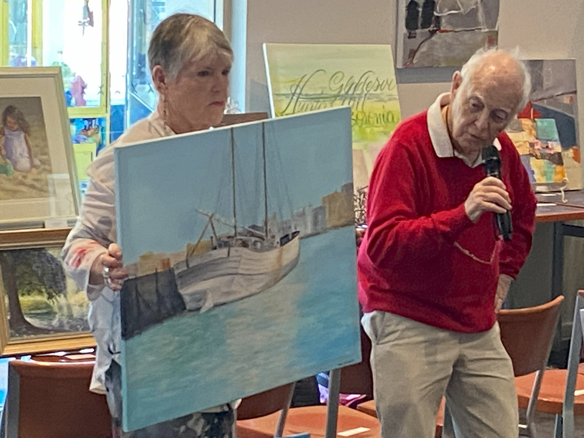 Each artist spoke on their “journey” into the art world and explained the meanings behind their paintings. Let me name and thank our artists (in alphabetical order). Sue Collins, Annette Dale, Barbara Enright, Barbara Gardner, Ann Juster, Karl Romandi, Tony Saunders and Fran Williams.